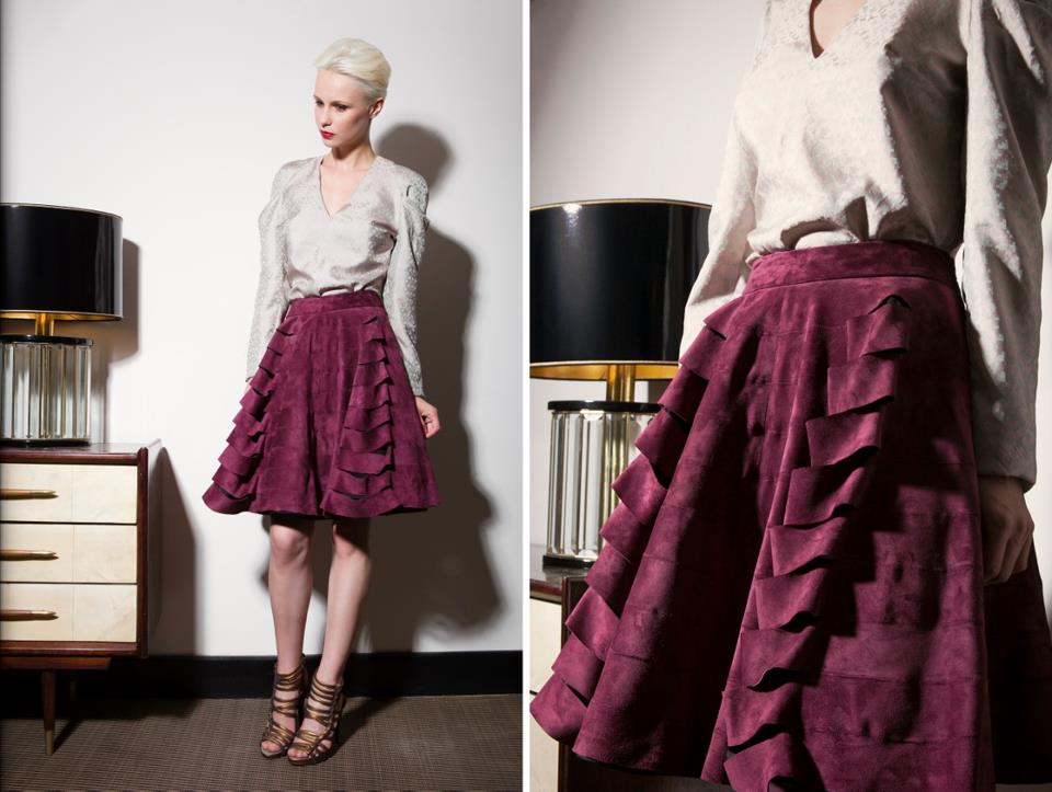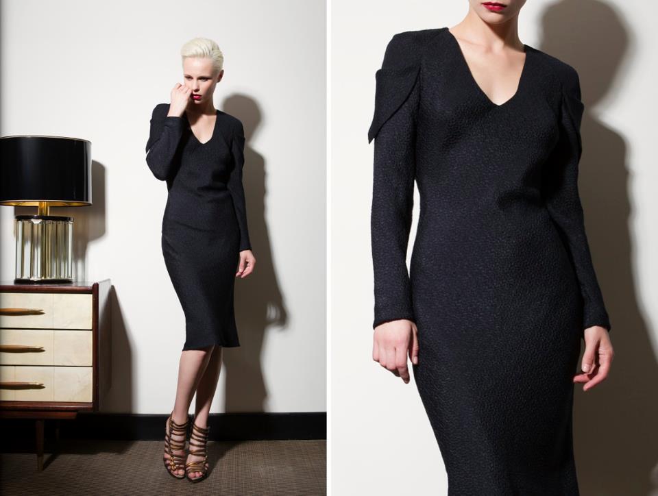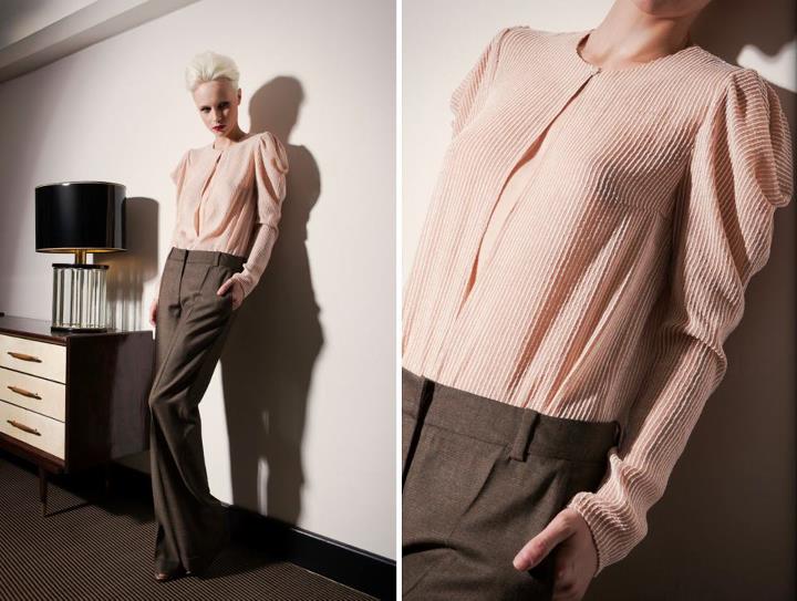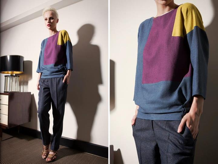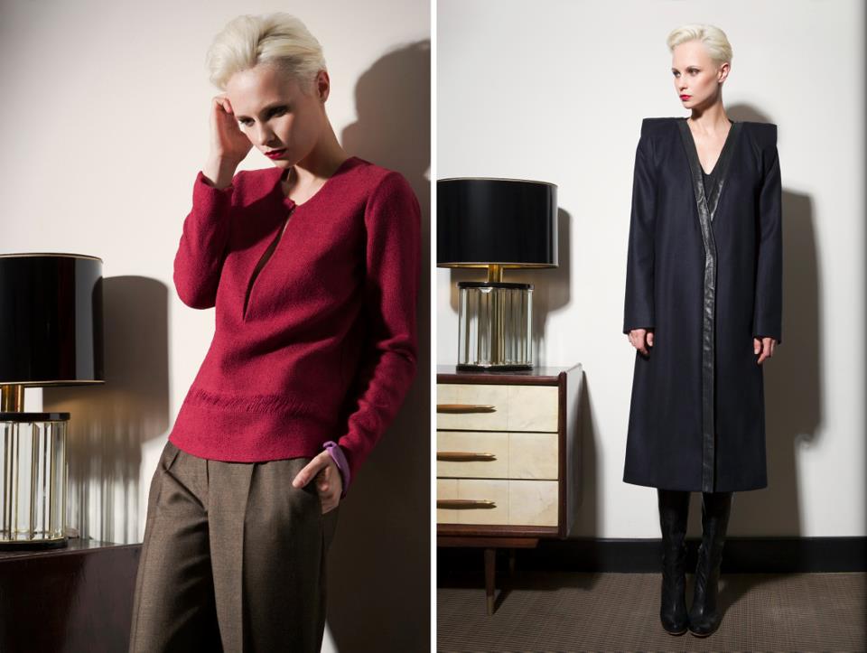 I Capi spalla hanno volumi essenziali, quando non diventano corazza, imponendo spalle alte a conchiglia; i pantaloni seguono linee pulite ed essenziali in tessuti da completo maschili (cachemire, lana/cachemire e lana pura 120’s di produzione nazionale); le bluse in bourette di seta tinta a mano sono in edizione limitata, così come le camicie in seta pura.