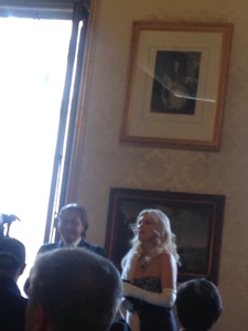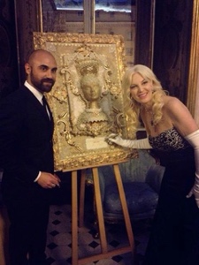 La Marchesa è arrivata accolta da una moltitudine di fotografi, scortata dalle sue guardie del corpo in un sontuoso abito nero a sirena, con un corpino adornato di pietre preziose, guanti lunghi bianchi ed al collo una preziosissima collana di famiglia di diamanti e rubini, al suo fianco Stefano Jurgens, al cospetto di 400 invitati selezionatissimi del mondo dell’aristocrazia, della cultura, dello spettacolo, dell’arte e della finanza.