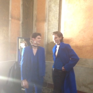 Giacche da cadetto e pantaloni con lacci in pelle 3D. Abiti con cromi e sature e inaspettate, volutamente provocatorie.