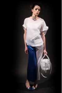 “Musa” di Vittorio Camaiani Marina Ripa Di Meana, interprete d’eccezione di “ContrariaMente”. Da sempre icona “del contrario” con la sua acuta ed ironica lettura del femminile, è intervenuta nel gran finale della collezione, con un outfits “collo camicia” ispirata al tema del perdersi … per poi ritrovarsi.