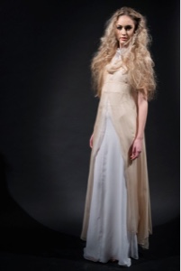 Un abito che potrebbe indossare una sposa viene ricamato nel décolleté con colli e polsi rubati alle camicie, come fosse un macramè impreziosito da cristalli e swarovski.