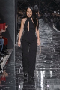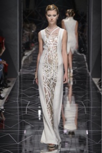 Dalla densa rete, costituita da lamine di acciaio parallele, emergono quelle verticali, che ispirano gli abiti nelle gradazioni del cobalto le cui fasce parallele avvolgono le curve della silhouette femminile.
