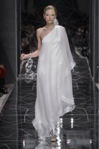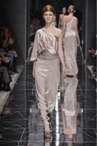 La cartella colori è influenzata dalle architetture a cui la collezione si ispira: bianco, nero, toni del cobalto. E un romantico rosa argenteo per il peplo della dea Aracne.