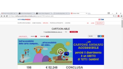 La piattaforma realizzata dalla società TIM, WithYouWeDo, ha selezionato il progetto “Cartoon-Able” che è stato presente sul sitohttp://withyouwedo.telecomitalia.com/ e finanziato pubblicamente sotto forma di donazioni con ricompensa morale.