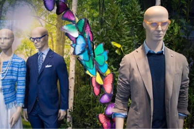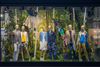 una vetrina scenografica VIVA dal sapore green che coniuga natura, arte e moda firmata dallo scenografo Tony Pignatelli.
