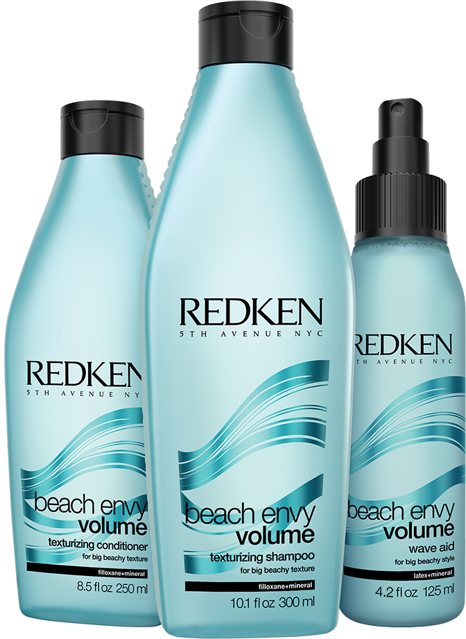 Redken BEACH ENVY Volume per una texture effetto-spiaggia con onde morbide ed elastiche : shampoo, conditioner e treatment-styler Volume Wave-Aid leave –in.