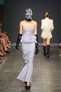 Molteplici i materiali usati: organza, georgette, duchesse, pelle, pelliccia ecologica e lattice che danno vita a linee fluide ricercate con eleganti plissettature e sofisticate asimmetrie. Risultati eccellenti nella silhouette sia da giorno che da gran soirée con colori che variano dal lilla al color pesca al rosso, al bianco e nero e ad elegantissime sfumature del grigio che si trasformano in scintillanti argenti.