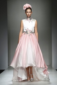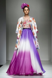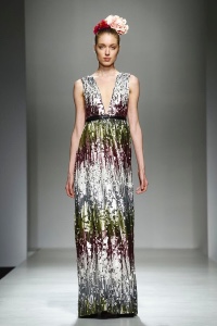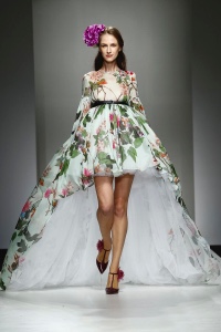 Combinazione come parola d’ordine negli equilibri dei capi, che vedono tra le proposte giacche sovrapposte a lunghi abiti ampi ed impalpabili. Mix sapiente di materiali e tessuti: mikado di seta, voile stampati con motivi floreali, pailettes sfumate e luminose.