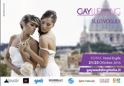 Tre giorni dedicati al “Si, lo voglio” per Tutti. Apre i battenti Gay Wedding Italia, la prima manifestazione della Capitale dedicata alle unioni tra persone dello stesso sesso. Tre giorni di esposizioni, incontri eventi allestiti presso l’Ergife Palace Hotel – Via Aurelia 619 a Roma – da Venerdì 21 a Domenica 23 Ottobre 2016, per offrire un punto di riferimento del mondo gay in tema di diritti e unioni civili.