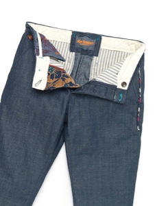 Questa stagione i dettagli della linea Superior si ispirano ai disegni floreali dei tessuti-tappeto dall’Archivio Roy Roger’s, acquistati in occasione di viaggi-ricerca in terre straniere. Riprodotti da un’azienda francese specializzata in tessuti jacquard di pregio, le nuove fantasie diventano i dettagli interni ed esterni dei pantaloni. Vengono usate per salpe ricamate in pelle nei jeans mentre, nella nuova proposta di chino – realizzato in un denim speciale, irregolare nelle fibre come i tessuti da lavoro anni ’50 – anche per dettagli come la bottoniera e i ricami delle tasche interne. E nella ricerca di una nuova identità, i pantaloni chino mostrano punte di colore nei travetti, nelle asole, nel piping a quadri, posto sul fianco sinistro del pantalone; e hanno una maxi etichetta con grafiche coloniali, all’interno della tasca destra.