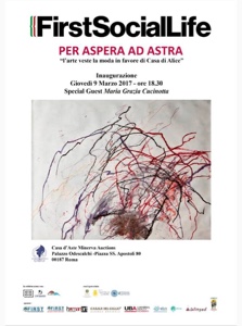 Ideata e prodotta dall’Associazione First Social Life – su progetto di Teresa Coratella e Eleonora Penna – viene presentata a Roma la prima mostra dal titolo “Per Aspera ad Astra”, una selezione di opere di artisti contemporanei da cui sono stati tratti preziosi tessuti – attraverso tecnica serigrafica – al fine di realizzare creazioni da sera di alta sartoria. In mostra una quarantina di pezzi tra tele d’artista, modelli e abiti da sera.