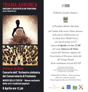 Nell’ambito della mostra “Trama Aurunca … Emozioni e Creatività di un Territorio”, realizzata in collaborazione con il Parco Naturale dei Monti Aurunci, che sarà possibile visitare sino al 30 Aprile al Museo delle Civiltà, presso il Museo nazionale delle arti e tradizioni popolaria Roma, le creazioni moda della stilista Lisa Tibaldi realizzate in stramma, faranno da scenario unico, al concerto di musica classica dal titolo “Intrecci di Note”.