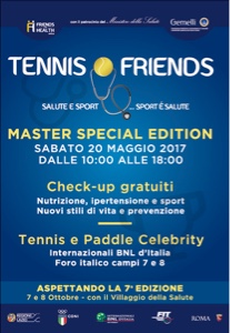 Torna l\’appuntamento agli Internazionali BNL d’Italia con TENNIS & FRIENDS Master Special Edition, evento che unisce salute e sport dedicato alla prevenzione gratuita, in collaborazione con la Fondazione Policlinico Universitario Agostino Gemelli di Roma, la Federazione Italiana Tennis e il Coni. Patrocinato dal Ministero della Salute, Regione Lazio e Comune di Roma, l’evento dedicato alla diagnosi precoce si terrà dalle 10 alle 18 al Foro Italico, in concomitanza con il Torneo Tennis e Paddle Celebrity.