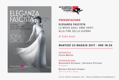 Martedì 23 maggio, alle ore 18.30, Sofia Gnoli presenta nell’Aula Magna dell’Accademia Costume & Moda “Eleganza Fascista. La moda dagli anni Venti alla fine della Guerra”. All’incontro, moderato da Cinzia Malivini, prendono parte la storica della moda Bonizza Giordani Aragno e i giovani designer Alessandro Enriquez e Salvatore Piccione.