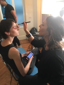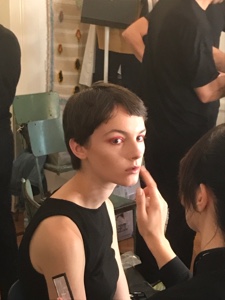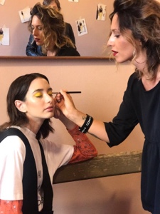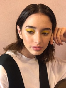 Colori molto accessi sugli occhi e incarnato perfetto questo il make up ideato da Roberta Betti, National Artist di Mac Cosmetics Italia, per la collezione SS18 di Coliac by Martina Grasselli.