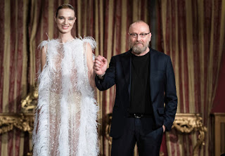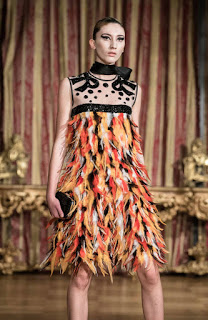 Protagonisti fiocchi ricamati con cristalli e paillettes come grandi e preziose spille. Li vediamo sulle giacche di taffetà e mikado, sugli abiti di rete trasparenti e sulle camice di taffettà accompagnati da leggere e soffici piume di struzzo.