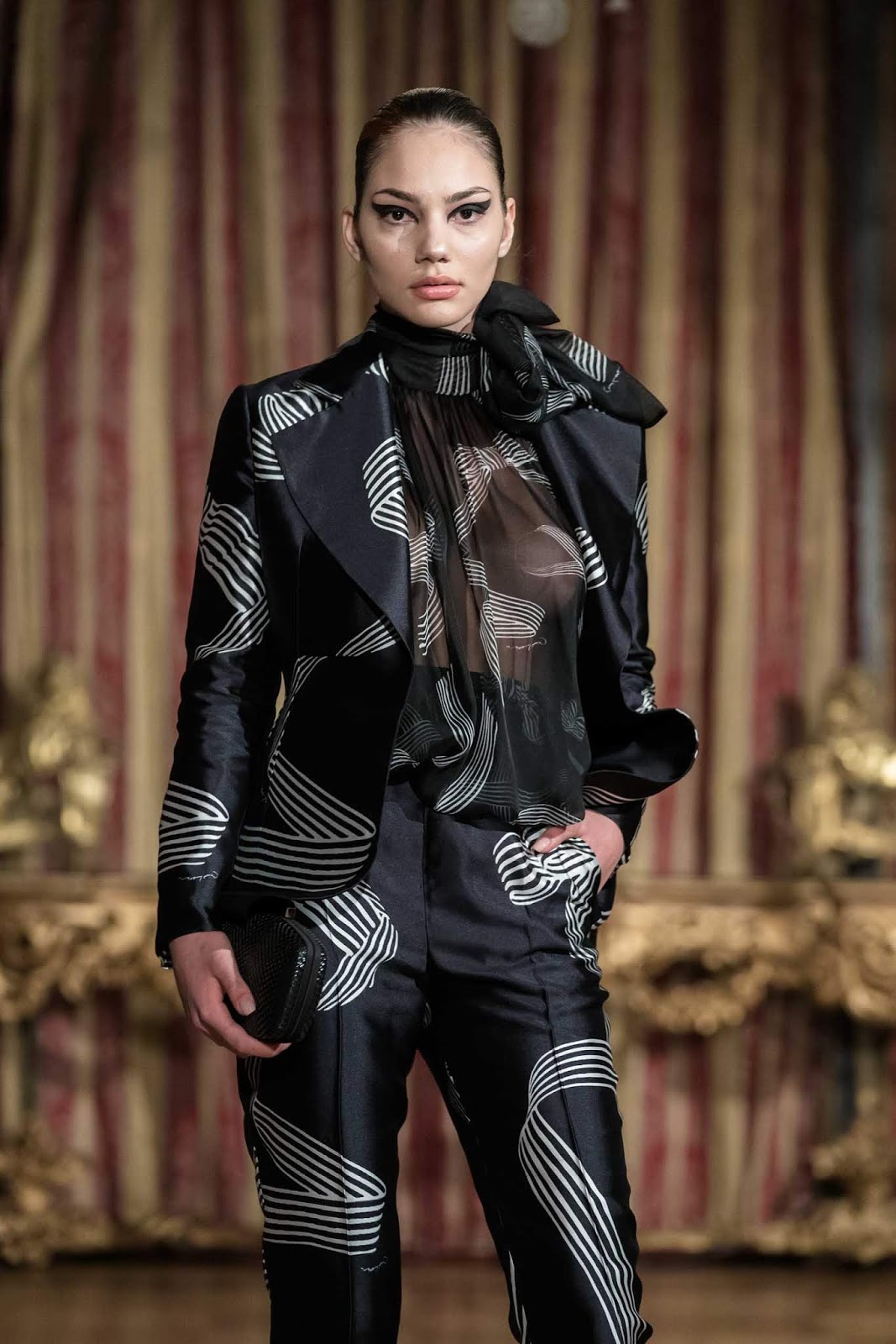 L’organza, il satin, il mikado, il taffettà, lo chiffon si alternano sia nelle stampe, disegnate dallo stilista, rappresentate da fiocchi a righe che volano, giganti e piccoli su fondo bianco e fondo nero, ma anche nelle tinte unite dei colori che Nino Lettieri suggerisce per la nuova primavera–estate sia negli ampi volumi delle gonne di taffetà da gran sera che per i tailleurs giacca pantalone dalle line tight.