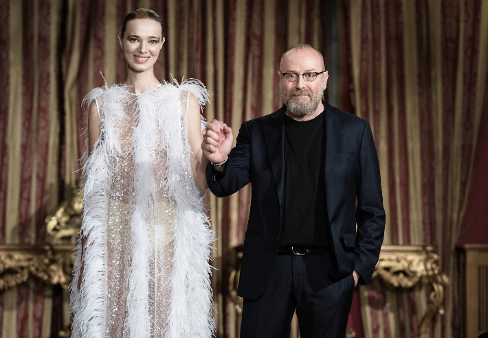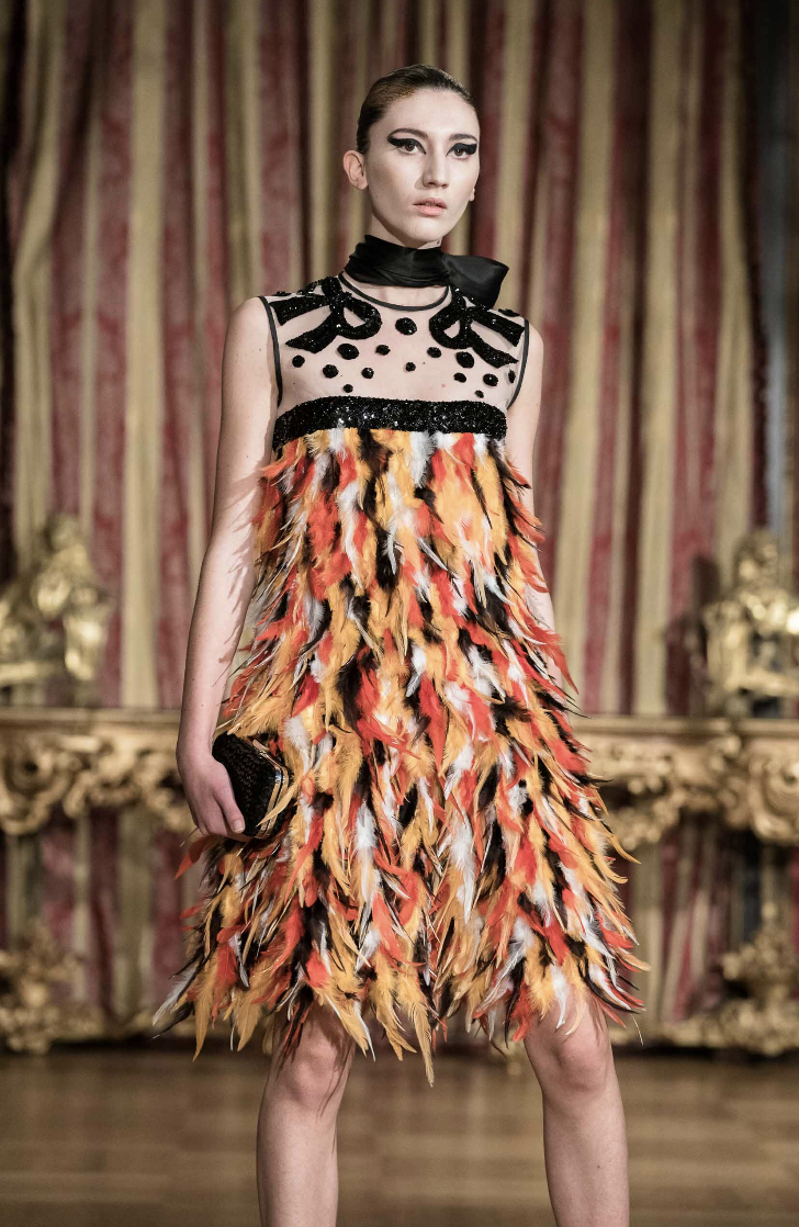 Gran finale con la “Sposa” Lettieri, un trionfo di paillettes e piume sull’abito dalla linea trapezio.