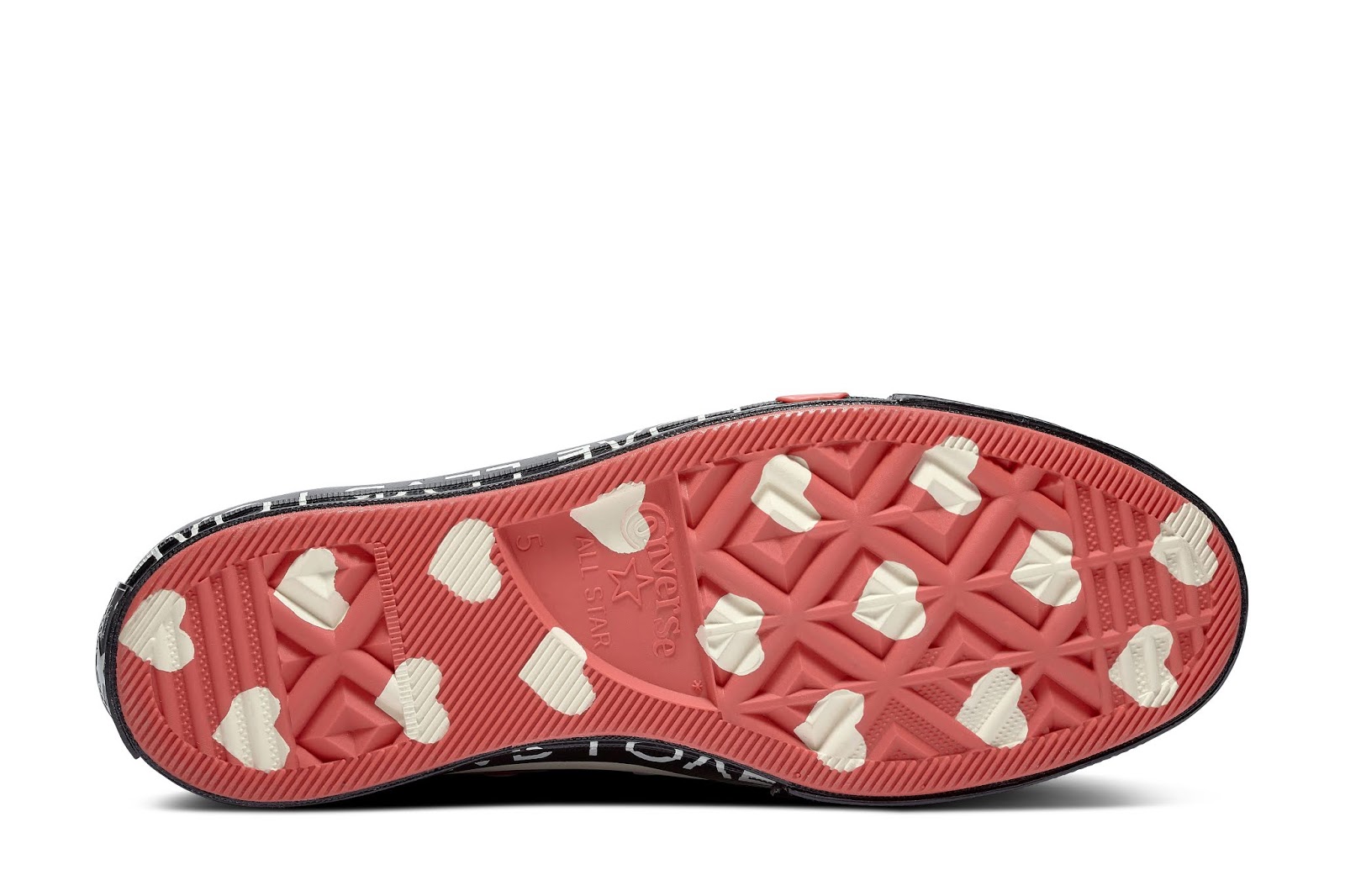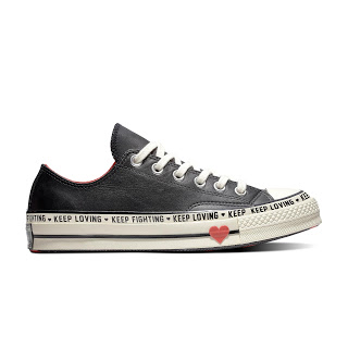 Un messaggio coraggioso e ricorrente, “KEEP LOVING, KEEP FIGHTING” con cuori scorre intorno all’intersuola, mentre al di sotto si trova una vivace grafica a forma di cuore rosso.
