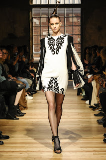 Le tuniche si fanno fluide e i nastri diventano spirali che abbracciano il corpo, il caban in visone ha