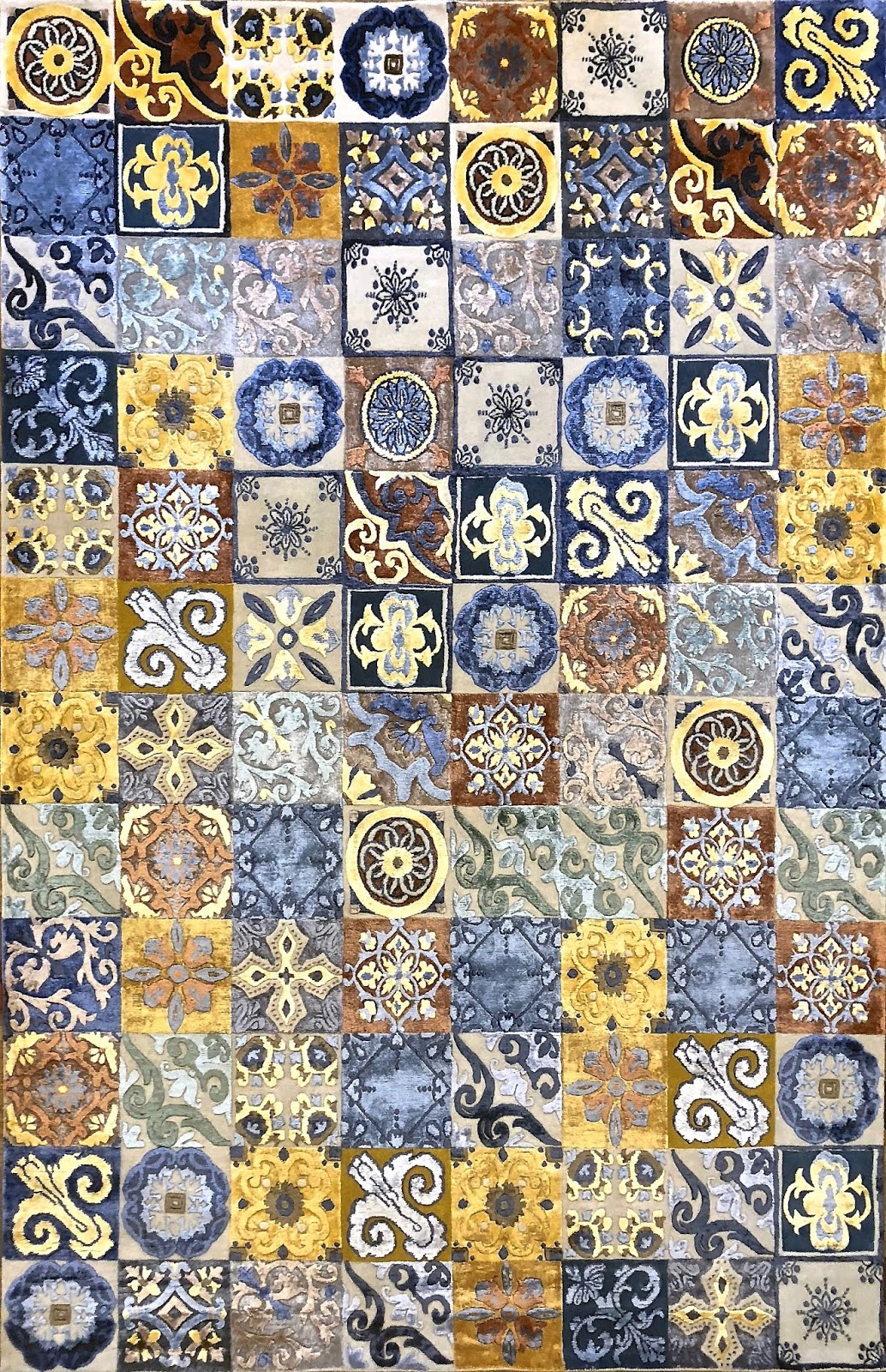 Alessandro ci porta così in Sicilia, come in un viaggio, prendendoci per mano e mostrandoci le maioliche dei vecchi monumenti, delle vecchie chiese, dei lussureggianti saloni delle feste di Palermo. Nascono quasi naturalmente durante questa “visita” i diversi disegni che reinterpretano le “catene” dei pavimenti antichi, riprodotti fedelmente su uno splendido tappeto realizzato in lana e seta, totalmente annodato a mano e disponibile in diverse misure.