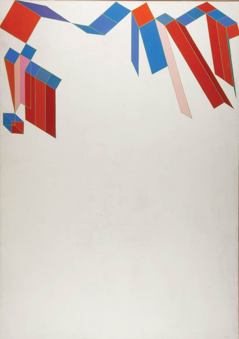 “La pittura di Perilli – dice Luca Barsi, curatore della mostra di San Pietroburgo e di questa, bellissima, romana – nasce come nuova configurazione dello spazio, apparentemente geometrica, ma in realtà sovvertitrice della prospettiva, percepita dal Maestro come “repressiva”. Come acutamente ha osservato Francesco Poli nella presentazione sul catalogo della mostra del Museo Hermitage di San Pietroburgo, egli si pone davanti alla geometria con lo stesso atteggiamento di un eretico: trasgredisce i dettami della geometria e della prospettiva così come un eretico trasgredisce la norma come ragione di vita. Le costruzioni impossibili di Perilli galleggiano su un fondo monocromo, non uniforme e immutabile, ma modulato dai toni e dalle pennellate; un fondo che descrive l’ambiente nel quale la pittura di Perilli si muove. E qui si ritorna al discorso iniziale, dove appunto si diceva dell’attenzione di Perilli per lo spazio: è vero, Perilli è un pittore intellettuale…”