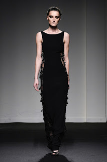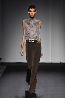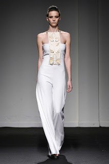 Outfit rigorosamente lineari e geometrici, come sempre di forte impronta architettonica, ma di estrema eleganza e sensualità, tra cui immancabili i capispalla e le tute, oltre che abiti da cocktail e da grande soirée.