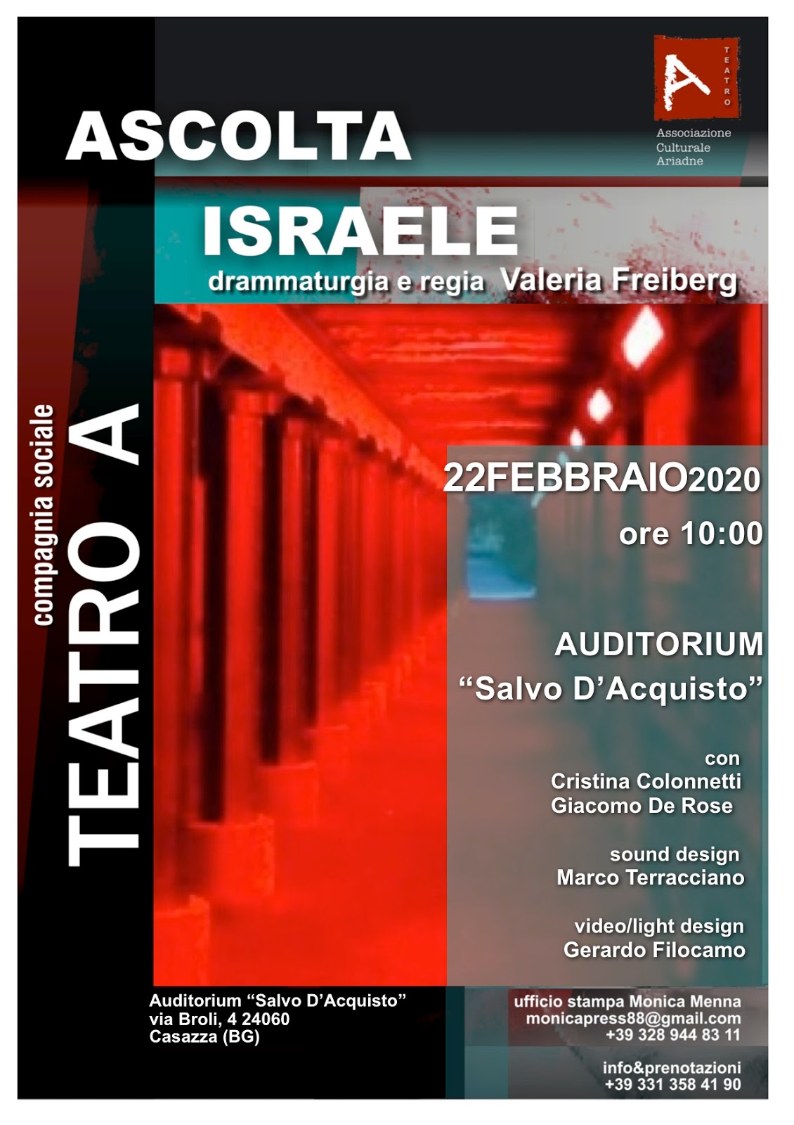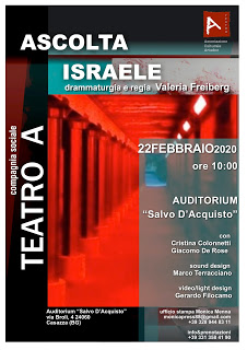 L’Associazione Ariadne – Compagnia Teatro Adiretta da Valeria Freiberg, torna in scena dopo il successo romano con la sua pietra miliare “Ascolta,Israele”, che sarà proposta all’Auditorium Salvo D’Acquisto di Casazza (BG) con una doppia replicasabato 22 febbraio.