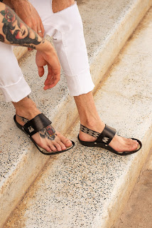 L’uomo è un giovane fiero che va incontro alla vita con entusiasmo e coraggio, pronto a svelare la nudità del suo piede. Anche per lui materiali come la vacchetta nei colori rubati alla natura, verde bosco, tabacco, testa di moro e per finire il nero rock. Il design accattivante si traduce in interventi di borchiette martellate, treccine di pelle ed elastici etnici.