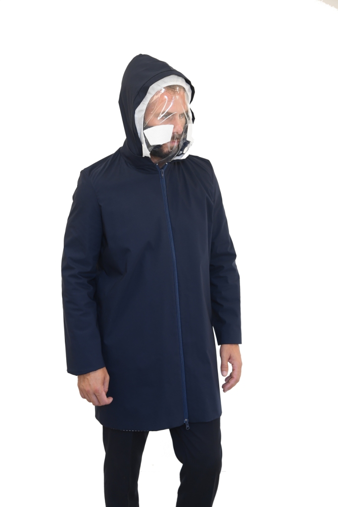 Il nome HUT, che in inglese significa rifugio o capanna, rende perfettamente l’idea: Hut è una giacca con cappuccio con un sistema di apertura/chiusura. Il cappuccio è dotato di una visiera trasparente, che permette il riconoscimento del viso e la lettura del labiale, e attraverso la quale l’aria permea grazie a due fessure dotate di un filtro. Il capo è strutturato a tre strati: uno esterno di tessuto impermeabile, uno centrale di tessuto filtrante agli agenti virali (meltblown) e una fodera interna.
