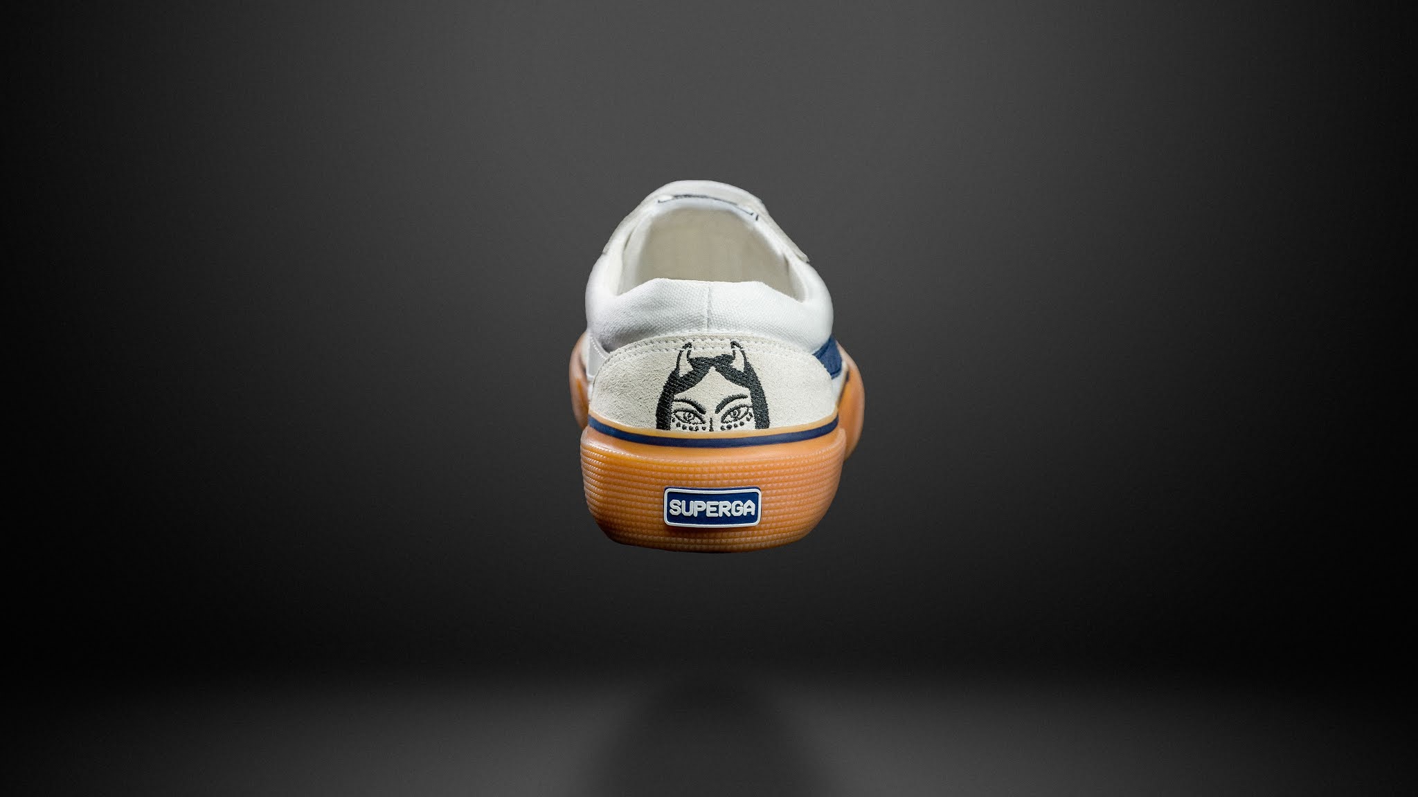 Il design della scarpa è completato infine dai loghi applicati sul retro, quello di Antonia ricamato in bianco sulla tomaia e il classico logo Superga applicato nella mid-sole.