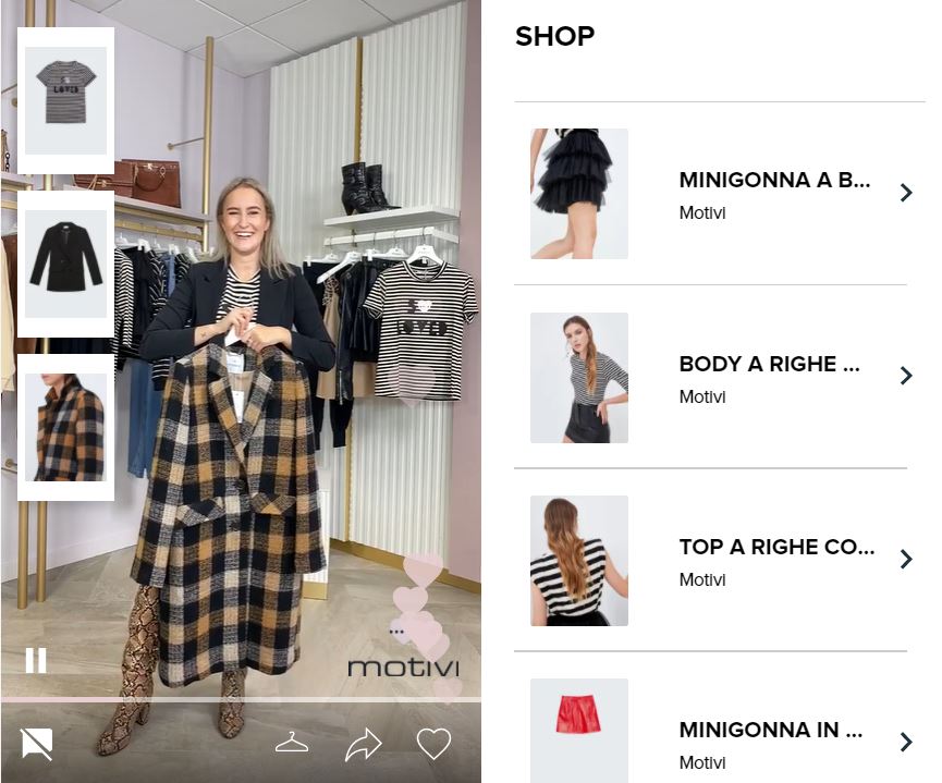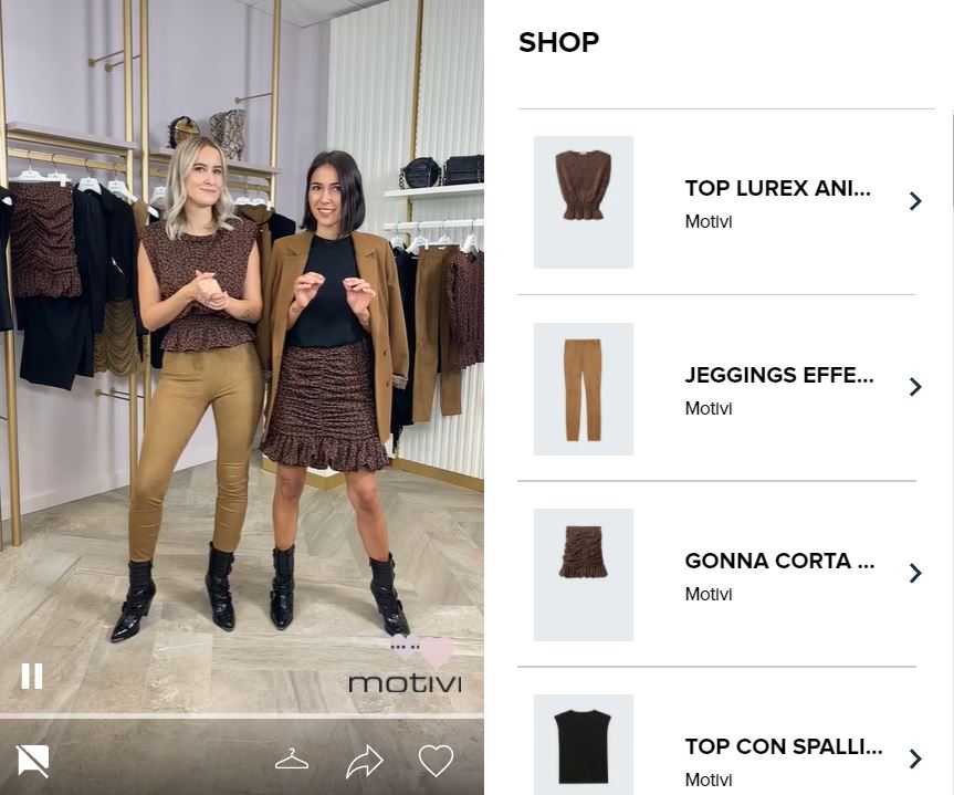 A partire dal mese di ottobre e fino a dicembre, con cadenza fissa ogni 15 giorni, Motivi propone delle live stream shopping assolutamente inedite, dedicate alle proprie clienti più affezionate, nel quale saranno presentati capi pensati e disegnati in esclusiva per la vendita online.