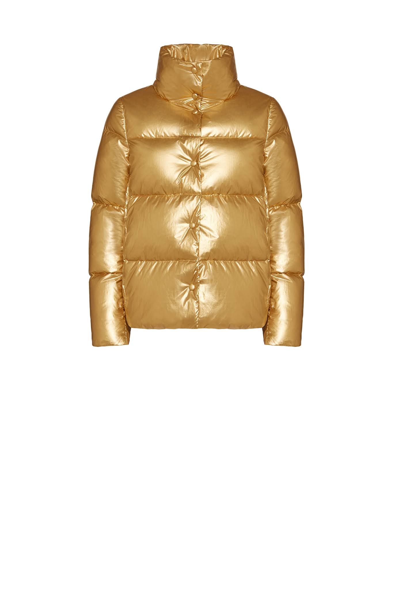 È la giacca Short fit in tessuto metallizzato a collo alto con imbottitura interna in piumino d’anatra; antivento e waterproof è chiusa da bottoni automatici doppiati di tessuto. Grazie alla texture metallizzata s’illumina di bagliori gold per look astrali e super performanti. Lunghezza ideale e easy-to-wear, è il capo outwear versatile per avventure urbane, con la testa fra le nuvole.