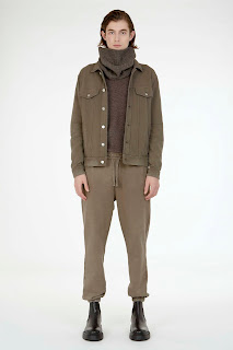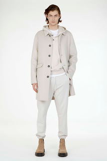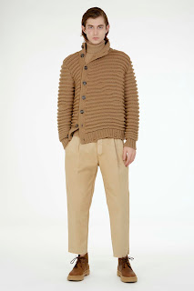 Suit e capispalla sono caratterizzati da un tessuto in jersey fantasia in lana stretch melange. Gli abiti si distinguono per le silhouette asciutte dalle proporzioni ridotte, mentre iblazer sfoderati sono pensati per essere portati come cardigan.
