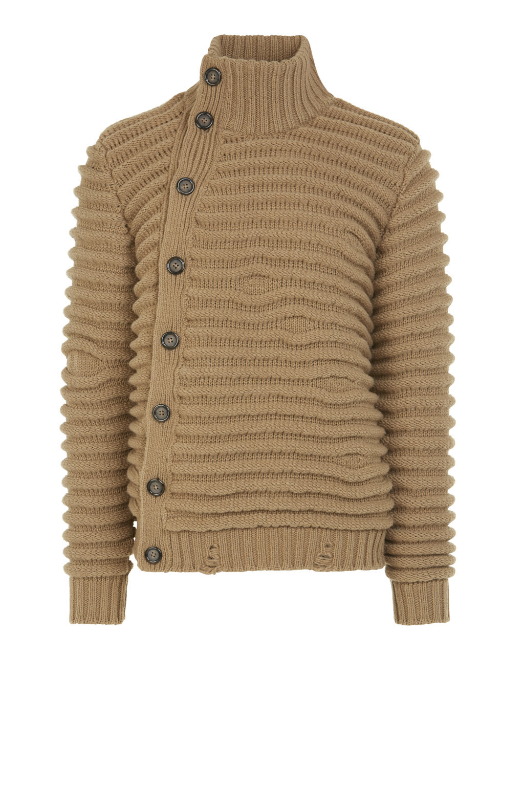 Cappotti foderati, doppio petto e mono petto, con collo a lancia in morbido panno fango, modica, asfalto e rovere. Capispalla sfoderati beige o neri e spolverini, proposti nel freddo calore ossimorico del bianco gesso. Giacche in eco-shearling cuoio con cappuccio e chiusura a zip o biker icona color ebano.