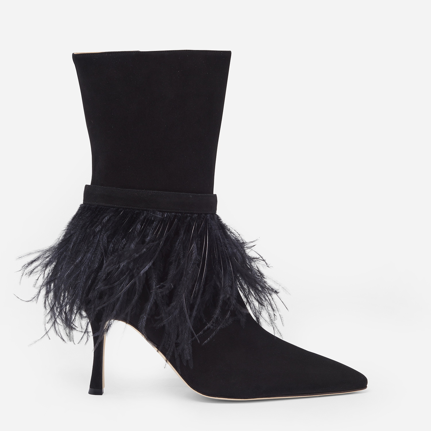 Le silhouette pulite ed essenziali sono arricchite da dettagli preziosi, come le spirali metalliche che avvolgono i tacchi sonori e le raffinate piume in degradè che ombreggiano le caviglie.