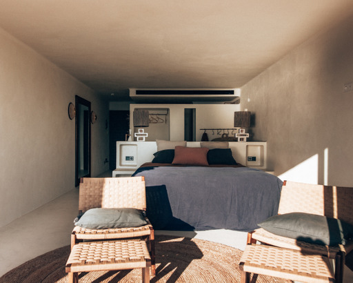 Strati testurizzati, toni neutri, pavimenti in cemento lucidato e materiali naturali come legno e lino si combinano con cesti di erba sparto e ceramiche per interni contemporanei che danno un senso di calma. Rispecchiando il luogo, molti degli oggetti decorativi sono stati acquistati da artigiani locali o sono sottili cenni alla ricca eredità del Pacha.