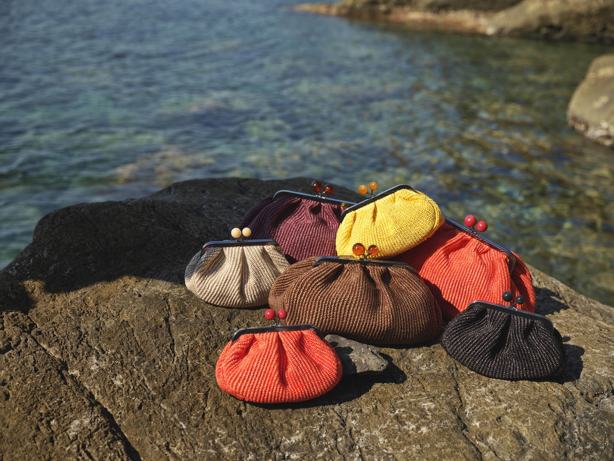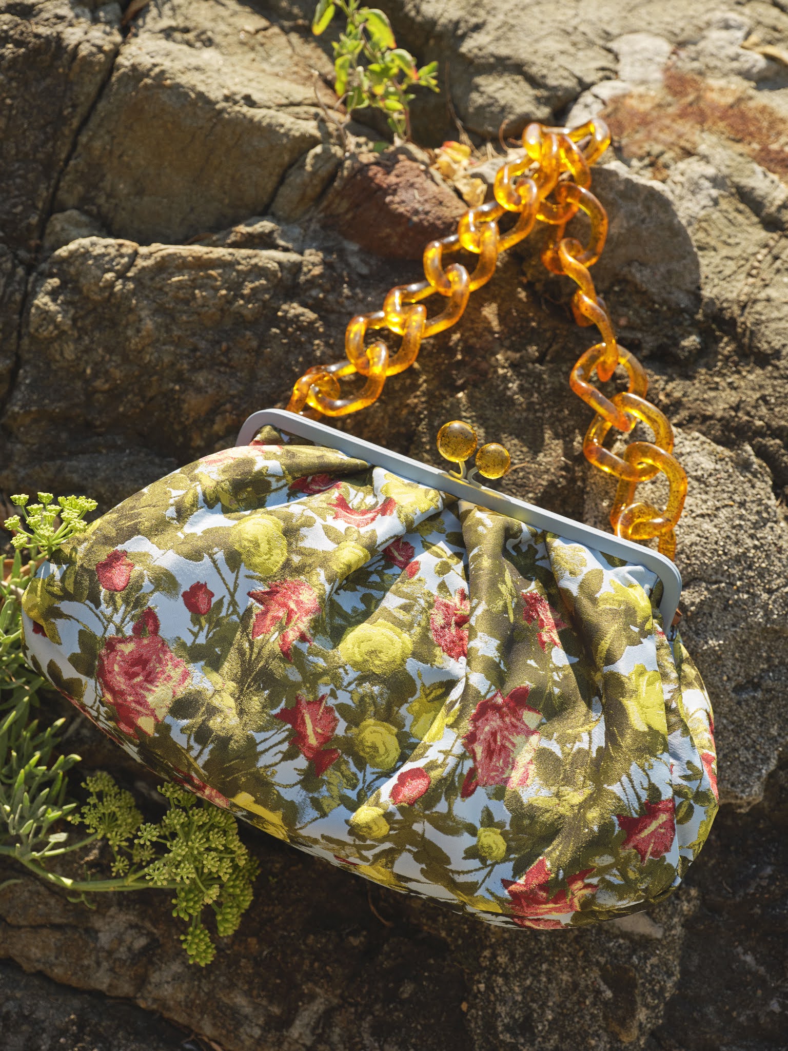 La special-edition in broccato floreale ha una tracolla a catena in resina color ambra, e le classiche versioni in nappa e in rafia sono caratterizzate da sfere, sempre in resina, che conferiscono un tocco di novità.