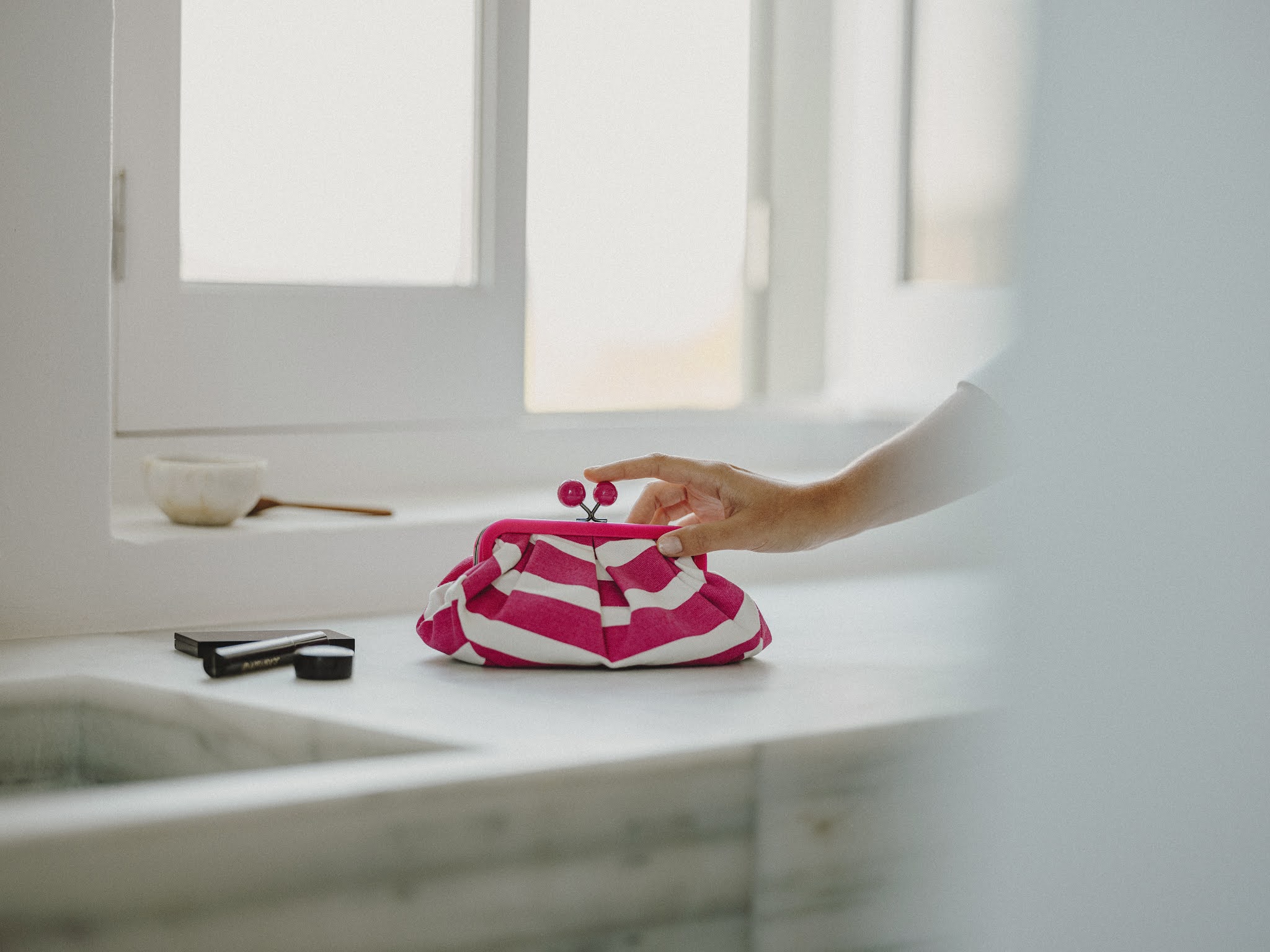 L’iconica Pasticcino Bag, con la sua inconfondibile forma a clutch e la chiusura a sfere, è proposta per la primavera estate 2021 in una versione crochet e nelle nuove varianti a righe dove il bianco si alterna a colori vivaci.