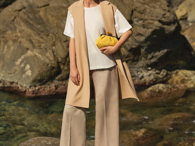 Il piacere di una giornata al mare. Il color sabbia e il beige, contrastati da tonalità vivaci che dall\’azzurro vanno fino al corallo e al color curry, danno vita alla palette perfetta per la bella stagione. Gli ampi orizzonti e il bagliore del sole caratterizzano queste giornate, ideali per sfoggiare i look dell’estate. Gonne fluide e top leggeri, sono perfetti per una giornata in riva al mare o in cima a una scogliera. Gli accessori completano il look: un cappello a cloche, delle scarpe slip-on e l’iconica Pasticcino Bag.