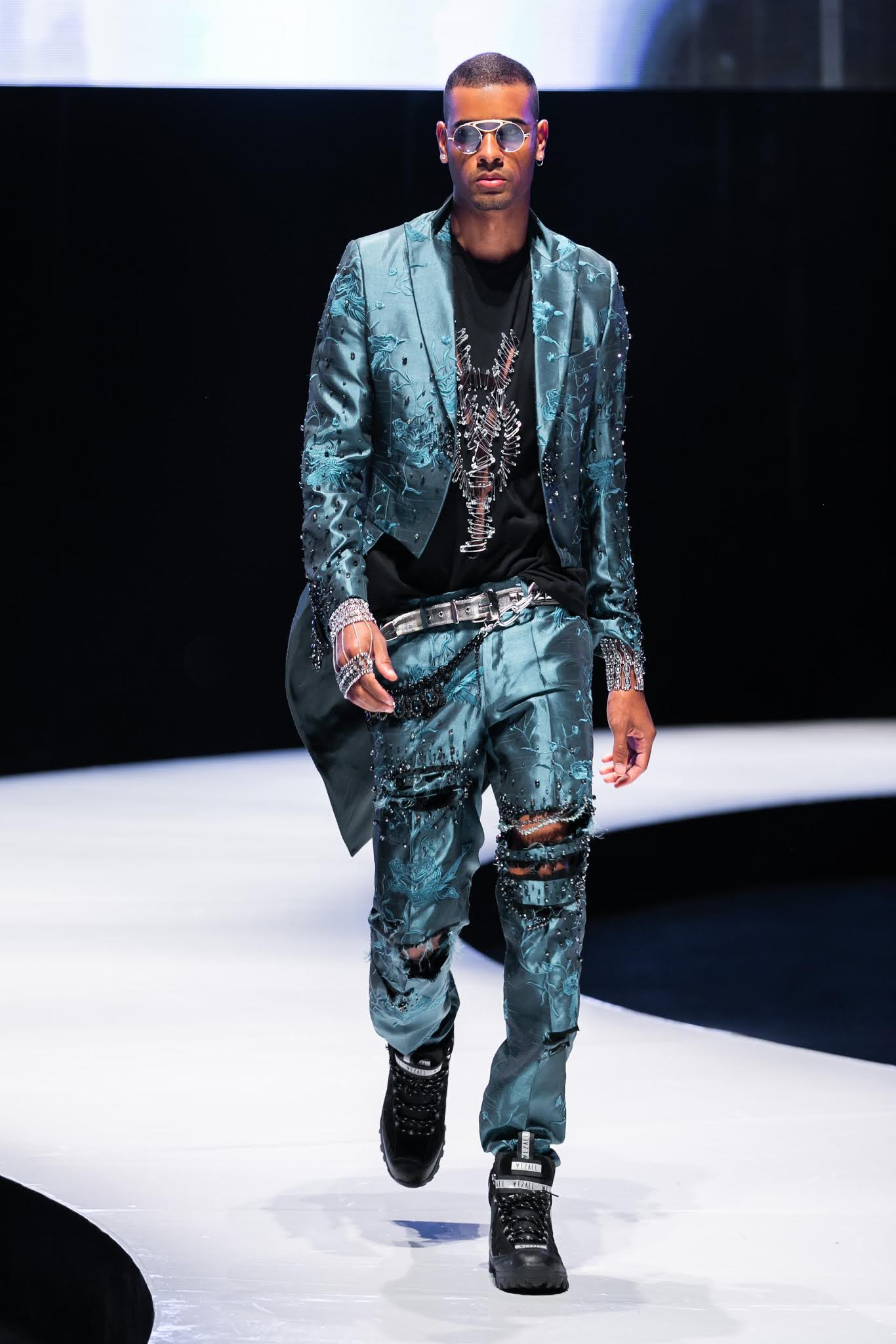 Yezael veste anche una delle new entry del cast, il misterioso Phillipe, un principe europeo che porterà scompiglio nel lussuoso istituto di Las Encinas. Interpretato da Pol Granch, cantante e attore spagnolo classe \’98, Phillipe è uno spirito libero e anti-convenzionale, e in un episodio indossa una delle creazioni dalla sfilata SS 20. Si tratta di un completo frac in prezioso shantung di seta color petrolio, con una serie di dettagli che mixano elementi grunge, come i tagli effetto used sui pantaloni, e romantici e preziosi, come le applicazioni di zirconi, zaffiri bianchi e acquamarine e i ricami 3D sulla giacca. Un look d\’impatto per Phillipe, il tenebroso principe combina-guai di Elite.