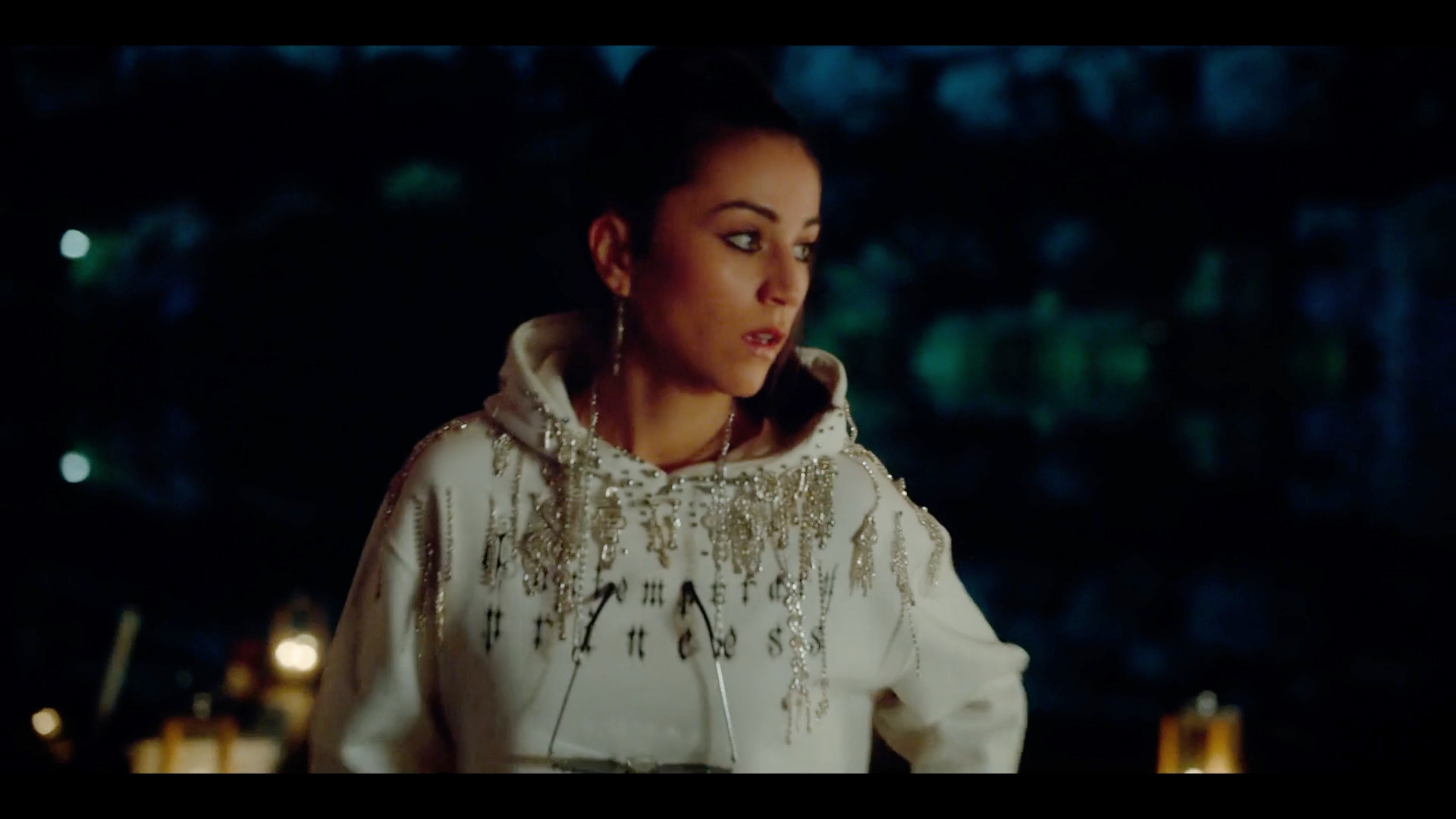 Oltre al lungo da femme fatale grunge, nella serie Rebeca sfoggia anche una serie di look più comfy, ma sempre infusi di un gusto prezioso e one-of-a-kind, del brand. Per una serata fra amici, sceglie la felpa da principessa post-punk. Taglio crop, cappuccio over, e una cascata di applicazioni preziose a contrasto con il lettering gotico e la nuance total white, uno statement piece che la rende la regina effortlessly cool della serie.