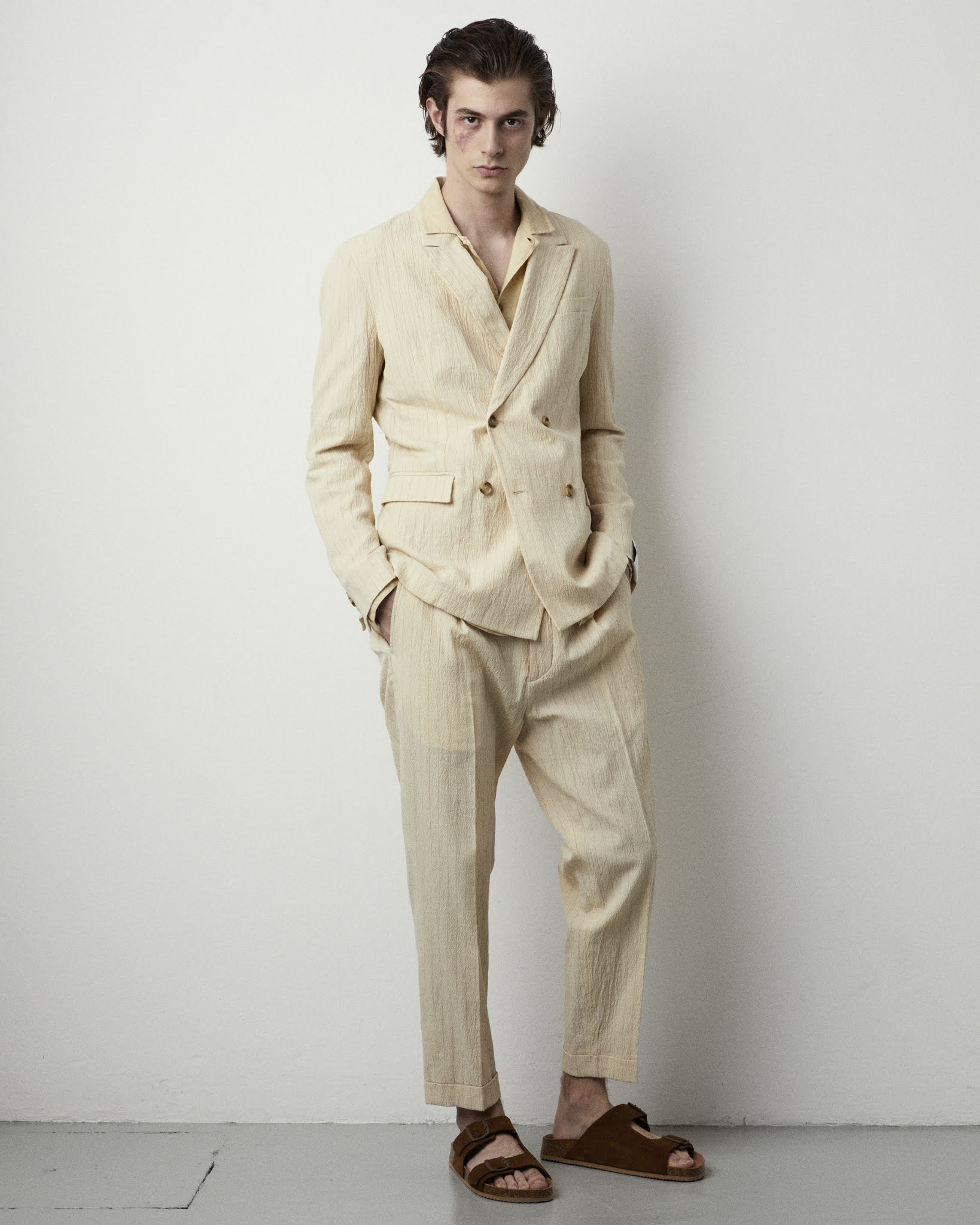 Tessuti stropicciati e materiali vibranti a trame aperte. Lino e cotone di jersey, lavorati con fissaggi leggeri e mossi o invecchiati ad hoc grazie ai trattamenti minerali, si contrappongono ai nuovi gessati, i suit ideali per cerimonie e summer occasion.