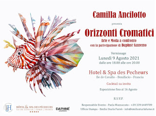 “Arte e Moda si fondono, a dimostrazione che la prima può essere non solo osservata ma anche indossata” – sottolinea Ancilotto – “In collaborazione con l’Atelier di haute couture DAPHNÉ Sanremo, abbiamo immaginato una collezione a 4 mani, a tiratura limitata di pregiati foulard disegnati e dipinti con soggetti affascinanti e colorati: colibrì che danzano in volo tra le peonie selvatiche, pesci leone dalle pinne sgargianti, nautilus tra gli anemoni di mare e gli uccelli del Paradiso tra gli ibiscus”. Una collaborazione artistica frutto del savoir faire di due eccellenze.