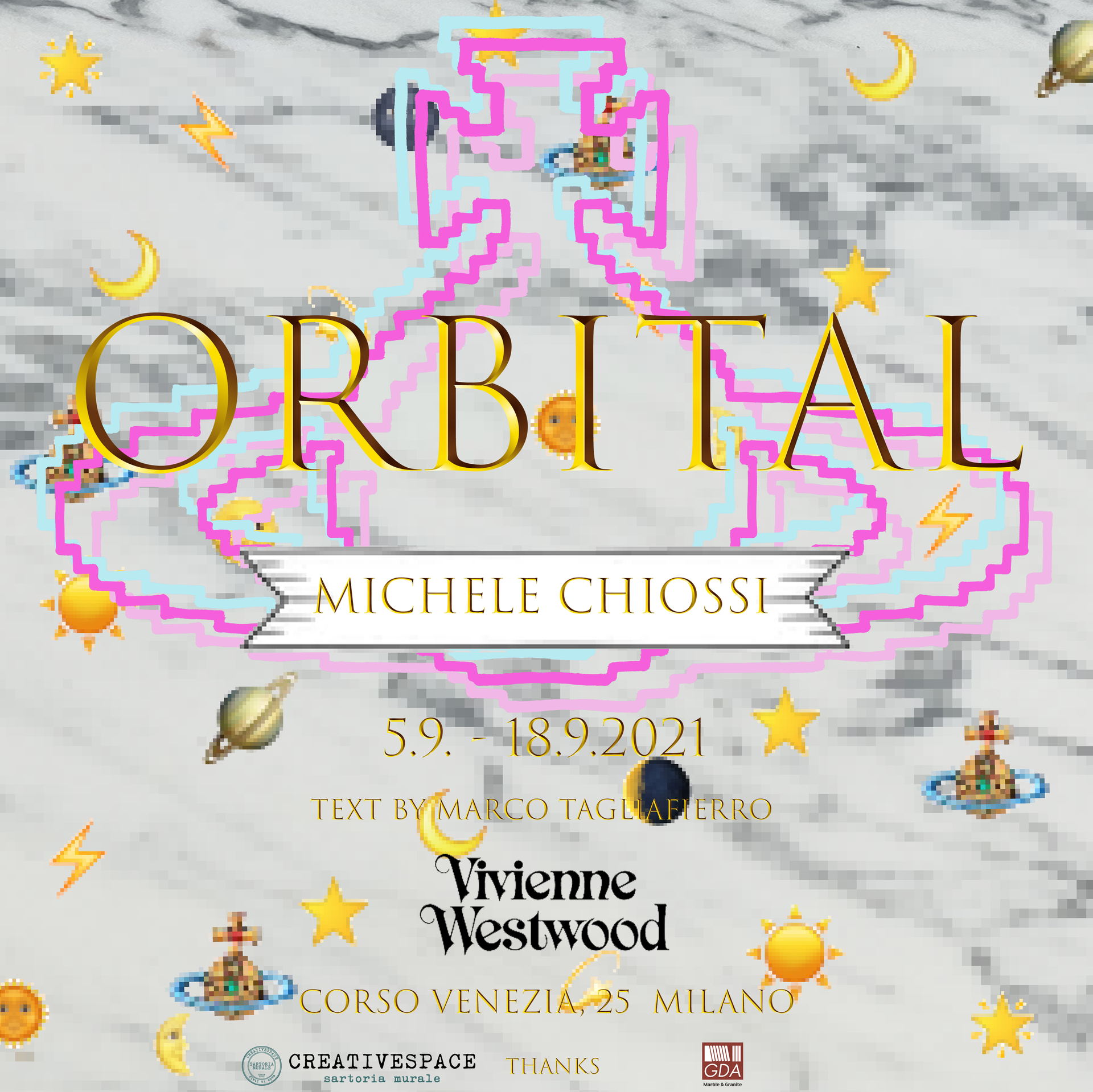 Per la trasfigurazione operata da Chiossi, l’Orb diventa un condensatore di simboli, giunti ad oggi, senza soluzione di continuità, provenienti da tutti i passati di cui abbiamo coscienza. Tutta la memoria del mondo si sedimenta in questi lavori d’arte per entrare in riverberazione con la semiotica di Vivienne Westwood. L’Orb, grazie alla visionarietà di Michele Chiossi, diventa “Orbital”, titolo di questo accadimento e scultura in marmo e acciaio sospesa e rotante che si andrà a stagliare su un wallpaper progettato dall’artista come un florilègio di emoji, rielaborato per l’occasione in versione limited edition. E ancora marmi, bronzi e specchi; se lo specchio esprime l’idea di guardare dentro di sé, l’Orb dinnanzi allo specchio è invitato a disvelare tutto il suo portato segnico.