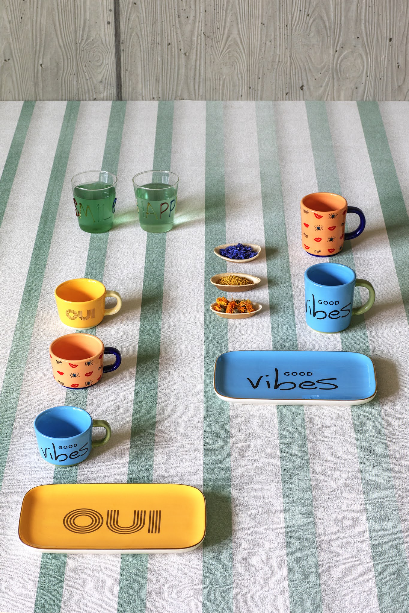 Disegni, pattern e morbide geometrie che si ispirano a momenti pensati per generare armonia. Oggetti con nuances tenui accostate a trasparenze e sfumature delicate che rimandano al mondo onirico, disegni floreali ispirati alle tecniche del pointillisme.