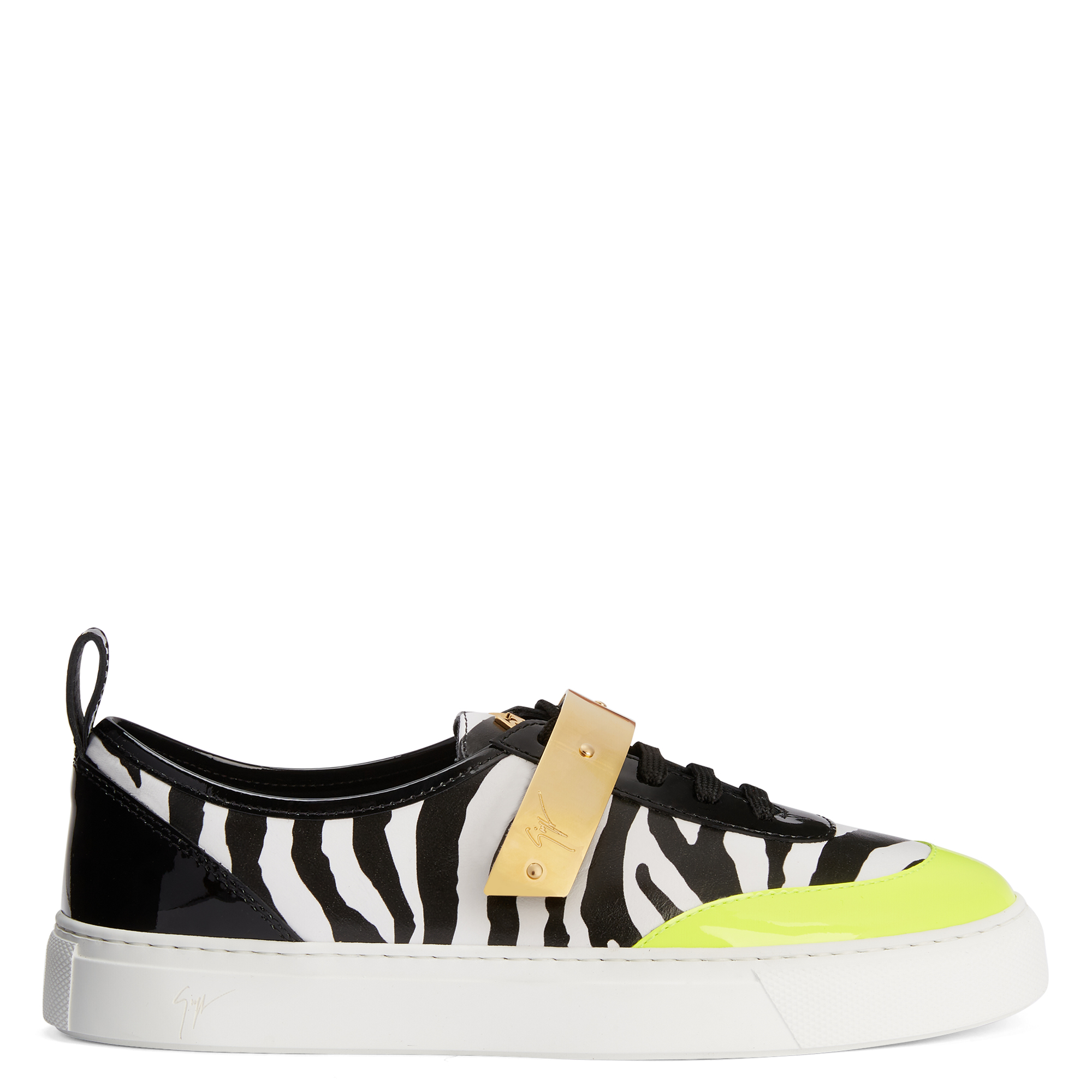 A completare la collezione con un tocco di dinamismo urbano, la sneaker Zenas è una rivisitazione glamour e cool dei modelli da tennis anni \’60. Arricchita dall\’iconica placca metallica simbolo del brand, Zenas unisce un motivo zebrato a accenti giallo fluo in una vivacità ottica esaltante.