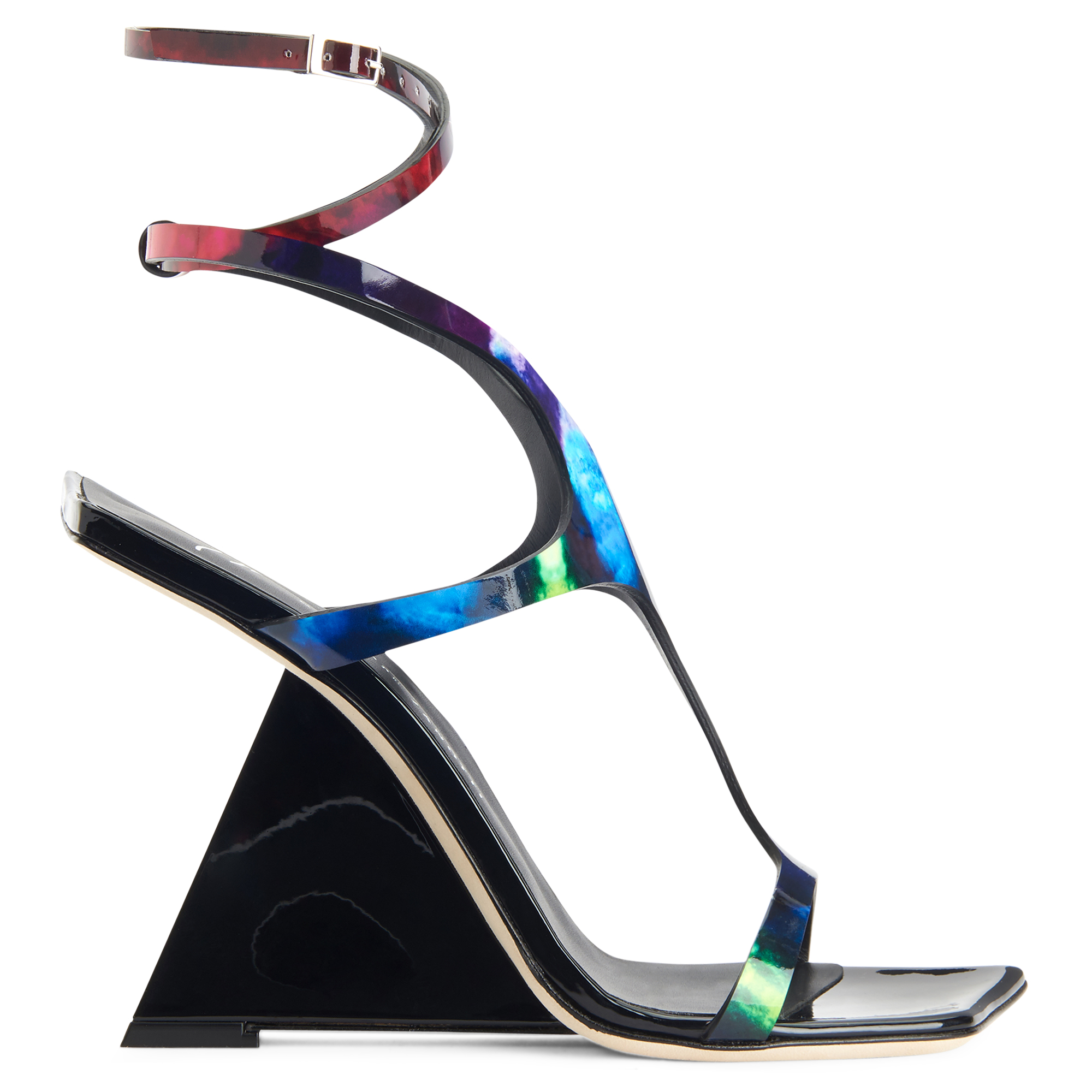 Rivisitazione di un modello presentato per la prima volta durante la collezione Primavera/Estate 2000, il sandalo senza tempo Tutankamon è la fusione perfetta tra passato e futuro. Suola geometrica e tacco scultoreo creano una silhouette grafica e futuristica ispirata alle linee delle piramidi egizie, mentre la stampa all over decora la tomaia a taglio vivo grazie ad un’innovativa tecnica di stampa digitale.