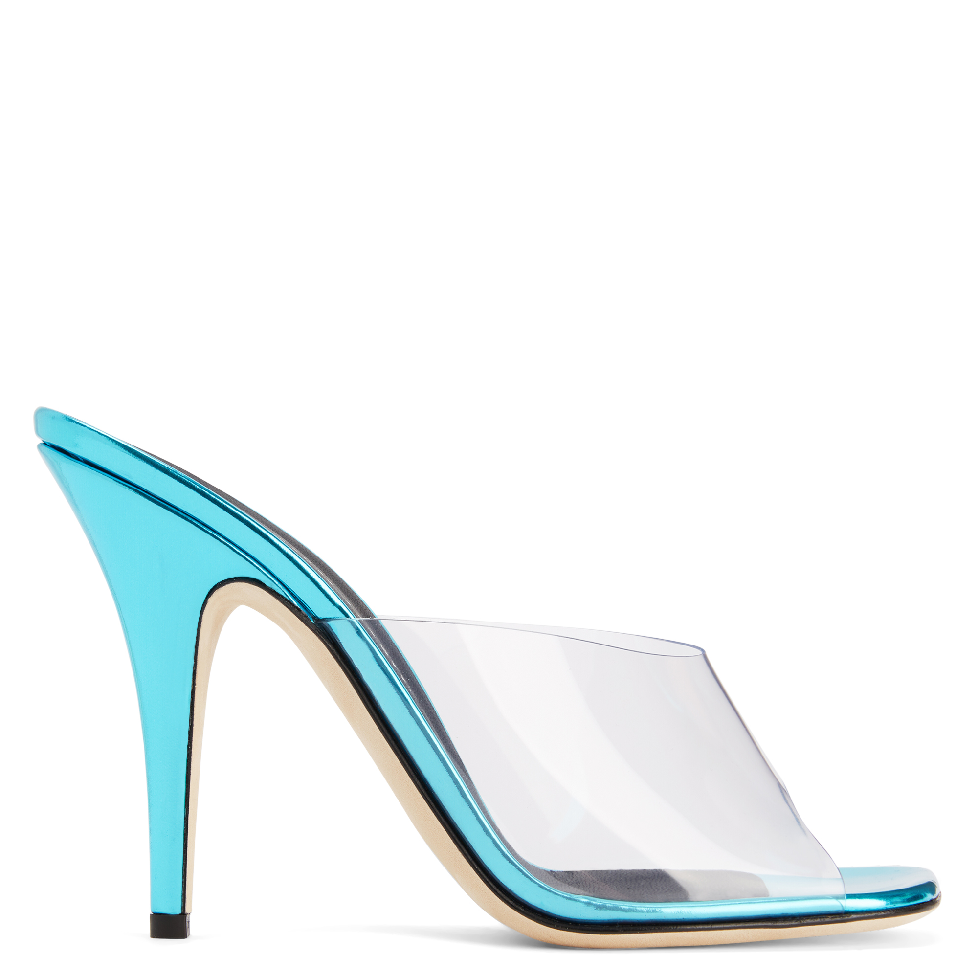 In un gioco di contrasti, il sandalo sabot Earthshine Plexi svela linee minimali che ricordano l’eleganza precisa e impeccabile delle immagini di Helmut Newton. Una punta geometrica smussata si combina a un tacco sottile per celebrare le curve femminili, mentre la fascia in vinile trasparente dona un tocco seducente.