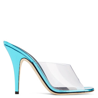Il vinile è anche protagonista nel sandalo Ejecta Plexi, dove la tradizione della calzatura gioiello viene rinnovata da una fibbia logo metallica che, come una pepita d\’oro fuso, si integra con la tomaia.